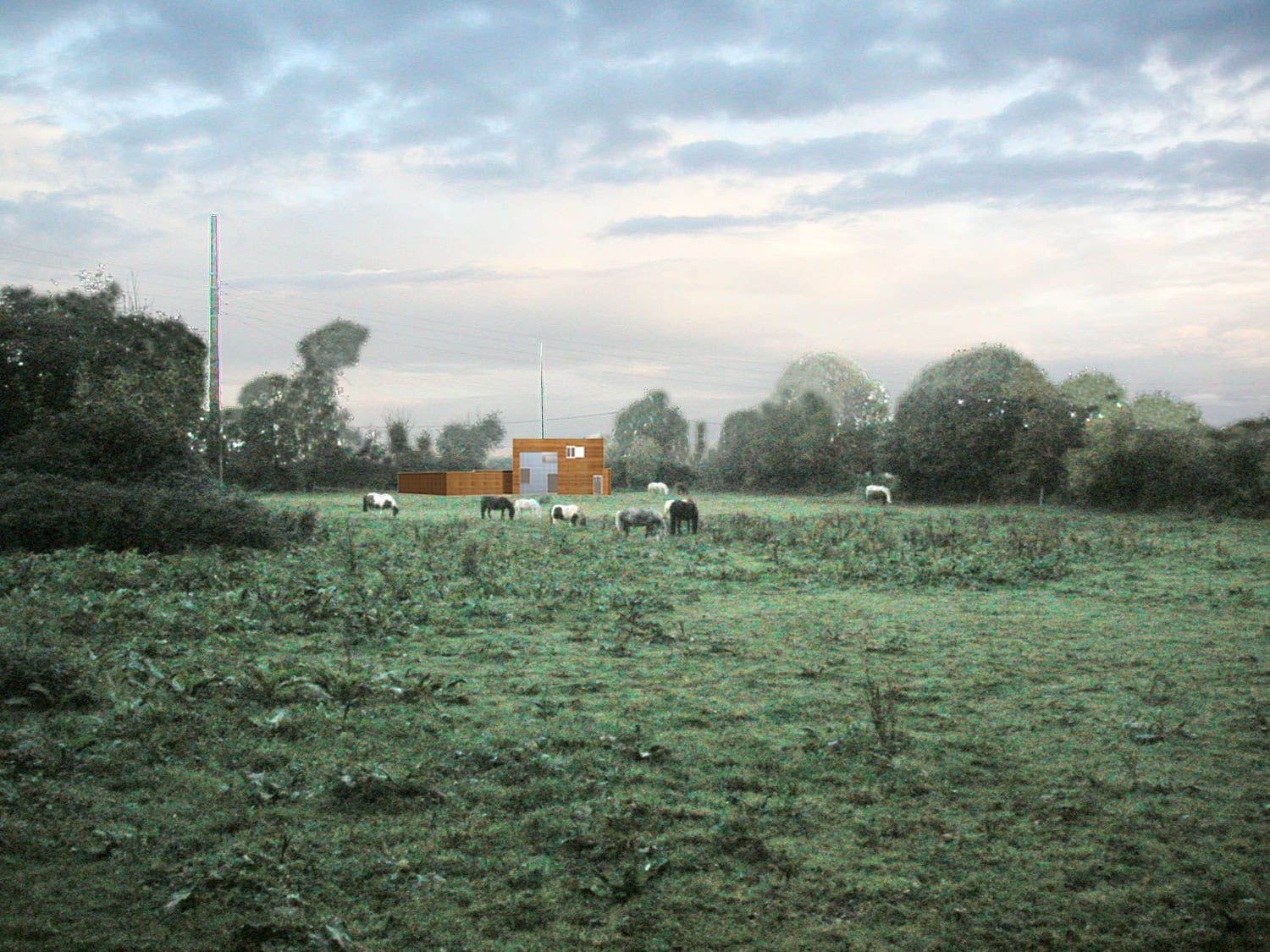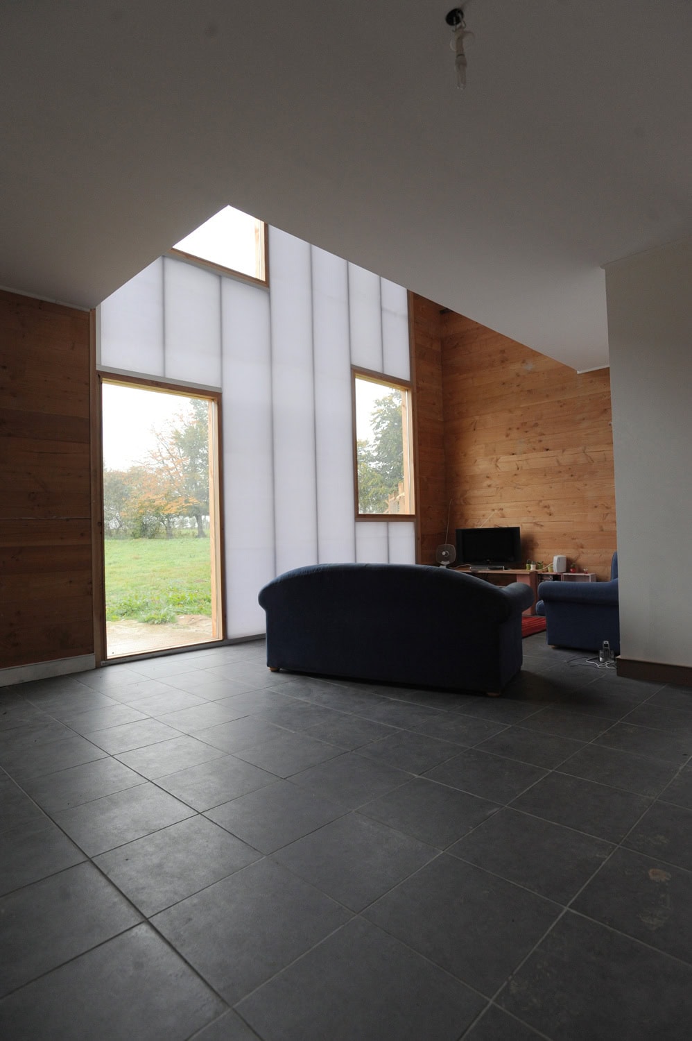 Les pièces humides sont des cellules préfabriquées en polyester, rapportées sur la façade Nord comme autant d’éléments branchés, éventuellement échangeables, et permettant une maintenance directe et facile. La famille est constituée de 4 personnes. Ils exploitent un centre équestre et ont choisi de bâtir leur maison au milieu des chevaux, dans un pâturage. Étant dehors toute la journée, confrontés à un paysage aussi vaste que grandiose, ils ont choisi une structure spatiale très repliée sur le noyau familial. La maison développe 120m² habitable et a été construite, avec l’accompagnement de notre agence YDAA, avec un budget extrêmement bas. Calculée au niveau BBC, elle s’avère plus performante que prévu de plus de 15%